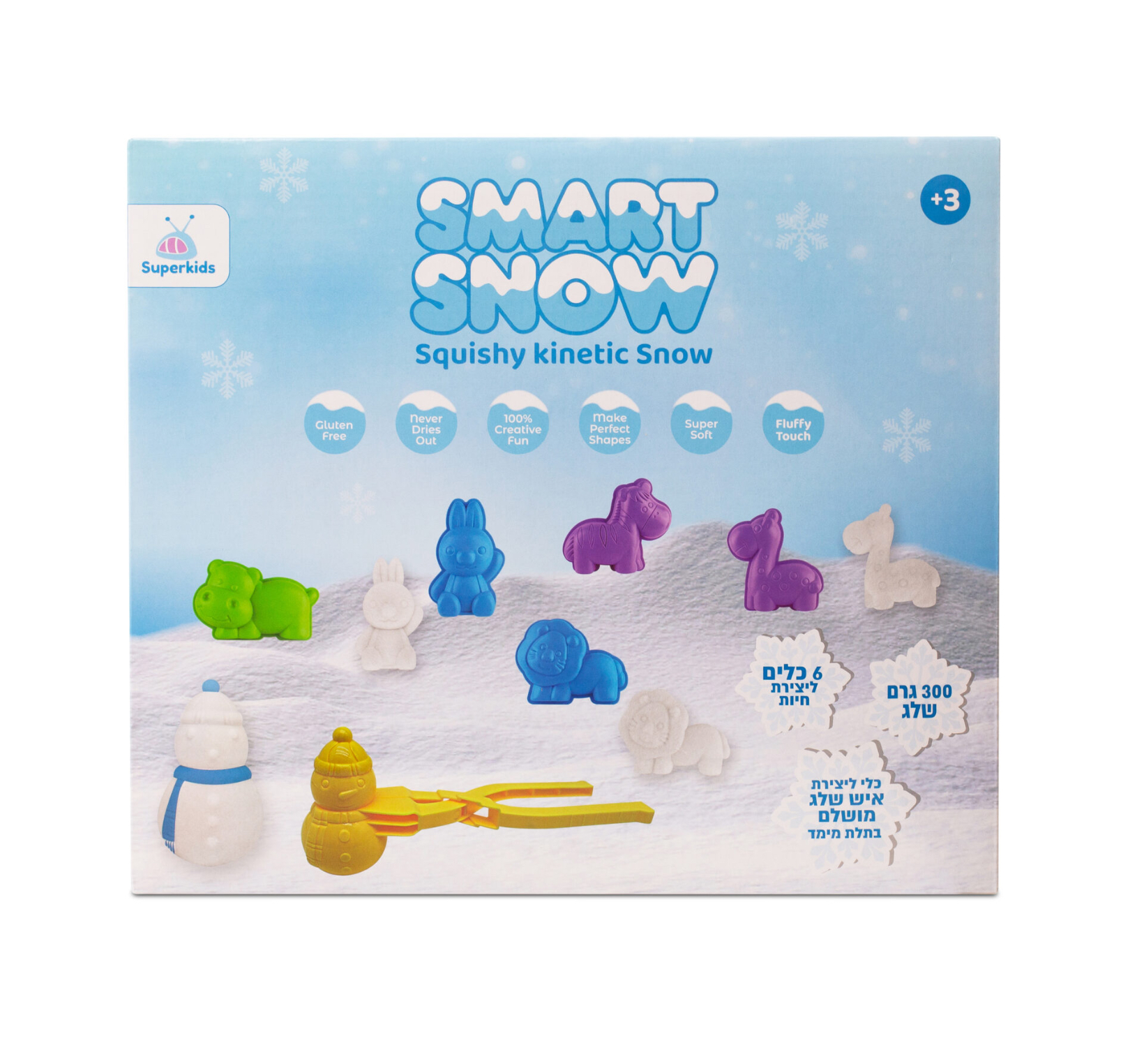 Smart Snow – בצק שלג סנסורי – אריזת 300 גרם + 6 כלים ליצירת חיות + מלחציים לבניית איש שלג